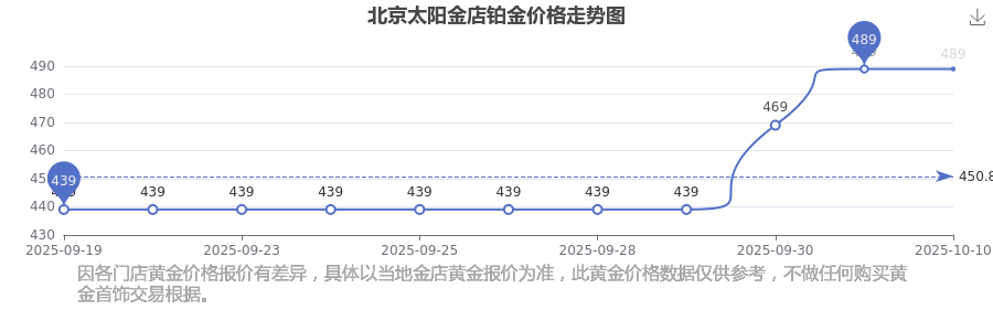 北京太阳金店今天铂金价格(今天黄金一克的售卖价格是多少)?今天北京太阳金店铂金价格查询,今天(2025年10月12日)北京太阳金店铂金价格最新价格为489.0元/克。